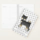 Desteis originelle Cartoon Illustration einer schwarz-bräunlichen Fellfarbe Shiba Inu Rasse Hund. Es gibt auch einen personalisierbaren Textbereich für einen Namen oder Titel. Der Hintergrund hat ein hellgraues Muster von Hundepfauendrucken.