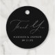 Elegante Hochzeitsfavoriten-Tags, die "Danke" in einem schönen weißen Kalligraphieskript mit schwarzem Hintergrund oder Farbe Ihrer Wahl darstellen. Personalisieren Sie die Vorderseite des Dankes bevorzugen Tags mit Ihren Namen und Hochzeitsdatum. Die Hochzeit danken Sie für Tag ehrt sich, um Ihre individuelle Nachricht, Hochzeit Foto, oder einfach verlass es leer. Entworfen, um mit unserer Hochzeitskollektion "Moderne Elegance" zu koordinieren.
