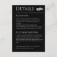 Mit unserer Detail-Enclosure Card "Schwarz-Weiß-Affäre" mit zeitlosen Schwarz-Weiß-Elementen und elegantem modernem Design stärken Sie Ihre Hochzeit. Diese Karte bietet den Gästen unverzichtbare Informationen zum Empfang und zur Unterkunft und sorgt für eine nahtlose und stilvolle Feier. Personalisieren Sie es mit Ihren Hochzeitsdetails, um eine einzigartige Touch, die den Ton für eine elegante Angelegenheit, die für die nächsten Jahre geschätzt wird.