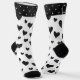 Hier ist ein Paar Socken mit einem Art-Déco-Look. Das untere Muster weist einen weißen Hintergrund mit einem schwarzen, herzhaften Muster auf. Die schwarze Band oben hat ein Muster von winzigen weißen Herzen.