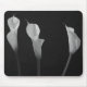 Elegantes Stillleben von Calla Lilies. Das Schwarz-Weiß-Foto der Blume ist einfach eine wunderschöne Fotografie. Der dunkle Hintergrund hinter der Lilie hebt die Schönheit der Blumenarrangements hervor. Das ist ein großartiges Blumenfoto für ein Mauspad-Design.