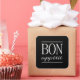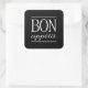 Schwarzer quadratischer Aufkleber mit weißem BON APPETIT-Lebensmittel Anführungstext.