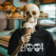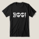 Der Hintergrund hat eine anpassbare schwarze Vollfarbe.. Sie können das ändern. Halloween Thema dunkle Tee für Oktober. Grunge Stil Boney B und Schädel "BOO!" Typografie.