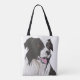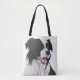 Dieses Tasche-Hinterteil zeigt ein wunderschönes Portrait einer Schwarz-Weiß-Border-Collie.