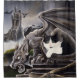 Das schwarz-weiße Tuxedo Kätzchen sitzt neben einem Gargoyle. Hinter ihnen steht ein Schloss und Drachen.