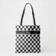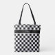 Dieses elegante Tote-Tasche-Design verfügt über ein schwarz-weißes Schachbrettmuster, das den Hintergrund für ein schwarzes Band darstellt, um Ihren Namen, Ihr Monogramm oder anderen Text zu halten. Suchen Sie ID148 um weitere Produkte mit diesem Design zu sehen.