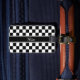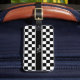 Dieses elegante Gepäckanhänger-Design verfügt über ein schwarz-weißes Schachbrettmuster, das den Hintergrund für ein schwarzes Band darstellt, um Ihren Namen, Ihr Monogramm oder anderen Text zu halten. Suchen Sie ID148 um weitere Produkte mit diesem Design zu sehen.