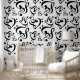 Die Tapete ist mit einem schwarz-weißen Stuhlschnitt und einem Basskernmuster versehen. Ideal für einen musikalischen Raum!