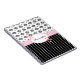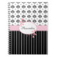 Ein trendiges Notizbuch mit einem schicken schwarz-weißen Damast-Muster auf der Oberseite und sassy pinstripes auf der Unterseite, geteilt durch einen gürtelrosa Blumenrahmen. Personalisieren Sie diese, indem Sie Ihren Namen hinzufügen. Perfekt für die stilvolle und modische Frau, die Streifen und ein Damast-Muster mag.