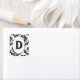 Ein wunderschönes schwarz-weißes Damast-Etikett mit einem ovalen Etikett, das den Buchstaben D enthält.