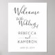 Dieses Hochzeitsplakat ist in einem schwarz-weißen Design gehalten. Dieses Begrüßungszeichen bietet einen handgeschriebenen schwarzen Text auf weißem Hintergrund.