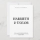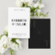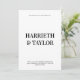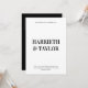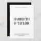 Die Einladung zur Hochzeit ist ein puristisches, minimalistisches Design mit fett-zentrierter Typografie, mit großen Serif-Schriftart für die Namen der Ehepaare und einem kleineren Großbuchstaben für die Veranstaltungsdetails, alles auf weißem Hintergrund. Die Rückseite hat schwarzen Hintergrund mit 2 initialen Monogramm.