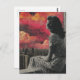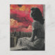 Die KI erzeugte eine gemischte Medienkunstkunst einer Frau, die auf einem Gebäude mit Blick auf die Stadt in den Farben Schwarz, Weiß und Rot saß