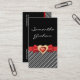 Schwarz-weißes Muster mit rotem Bogen- und Juwelierschablone mit schwarz-weißem Muster mit diagonalen Streifen und einem roten Band mit einem Bogen und einem herzenförmigen Juwel, ebenfalls in Rot mit goldener Kontur und Strähne, das ein wenig Bling verleiht. Beachten Sie, dass der Bogen und der Herz-Diamant-Schmuck ist eine "gedruckte" Abbildung und nicht ein echter Kristall, so sind die Schichten. Ein elegantes und stilvolles feminines Visitenkartendesign. Trendy, modern und modern, perfekt für berufliche oder persönliche Zwecke.