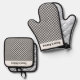 Schwarz-weiße Gingham Karo Design Oven Mitt und Pot Holder Set mit anpassbarem Text.