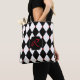 Ein stilvolles, schwarz-weißes harlequin-Muster mit roten Akzenten und einem eigenen Monogramm, das Sie mit Ihrem ersten oder anderen Text bearbeiten können. Um den Schriftart zu ändern oder neu zu zentrieren, wählen Sie den Button "Anpassen".