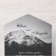 Schwarz-Weiß Hochzeit unter den Bergen. Landschaftsfoto eines schneebedeckten Berges mit Dunkelheit unten und weißer bewölkter Himmel oben. Die Namen des Ehepaares sind in schwarzem Schriftart über dem Berg am Himmel und alle Details sind in weißem Schriftart unter dem Berg. Vollständig anpassbare und personalisierbare Hochzeitsprodukte.