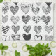 Spielender Katzensprung in einem herzförmigen Ballon, umgeben von verschiedenen gemusterten Herzen in Schwarz-Weiß.