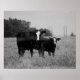 Original Schwarz-Weiß-Foto einer schwarzen Kuh und ihr kleines, schwarzes Kalb, das neben ihr stehend ist, hinter einem gegrillten Zaun, der mich und die Kamera ansieht. Wir reisten durch die Hinterstraßen von Oklahoma und hielten neben dem Feld für eine Hintern-Pause an, als die Kühe neugierig wurden und einer von ihnen zum Zaun umwanderte, um uns aus dem Karo zu holen. Ich musste ein Foto machen! Dies wurde im August 2021 aufgenommen. Ein BohippianFinch Originalfoto.
