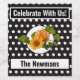 Maßgeschneiderte Weinflaschen für jeden Anlass. Schwarz-Weiß-Polka-Punkte auf schwarzem Hintergrund und ein großer weißer Kreis mit einer schönen Sonnenblume und Kürbisbild, die sich aus dem Kreis ausbreiten. Matching-Elemente auch in den "Sammlungen" verfügbar. Sie können die Nachricht von "Feiern Sie mit uns" auf alles ändern: Herzlichen Glückwunsch zum Geburtstag, Glückwunsch! oder andere Nachricht. Sie können auch den Namen unten von "The Newsmans" zu jeder anderen Person oder Person ändern: Von Ihren Bestie, von der Mama, etc.