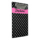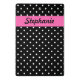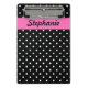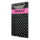 Schwarz-Weiß Polka Punkt Muster Mini-Zwischenablage. Weiße Polka-Punkte auf schwarz und in der Mitte gibt es eine heiß rosa Band, wo Sie Ihren Text hinzufügen können.