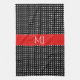 Elegantes, weißes Polka-Dot nahtloses Muster über schwarzem Hintergrund mit roten Akzenten und benutzerdefiniertem Monogramm.