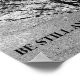 Schwarz-Weiß-Reflexion eines blättrigen Winterbaumes in einer Pfütze. Ich fand dieses Bild eines Wintertages in einer Pfütze geschmolzenen Eises. Ich fügte den Satz "Sei still und weiß, dass ich Gott bin" hinzu, weil er mich an jene Tage des Winters erinnert, an denen die Bäume kahl stehen und ihren Atem zu halten scheinen, während sie auf den Frühling warten.