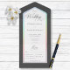 MIT ODER OHNE QR-CODE ODER ABENDESWÄHLUNGSOPTIONEN. Dieses Design zeichnet sich durch einen schwarzen Holzkohle-Hintergrund mit einem weißen Textbereich aus, der in einem pastellfarbenen Regenbogenrahmen gerahmt ist. Ein Monogramm mit dem ersten Auftakt der Braut und des Bräutigams auf der Außentafel vervollständigt es. Erstellt von der einfachen Farmhouse Press.