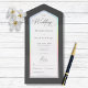 MIT ODER OHNE QR-CODE ODER ABENDESWÄHLUNGSOPTIONEN. Dieses Design zeichnet sich durch einen schwarzen Holzkohle-Hintergrund mit einem weißen Textbereich aus, der in einem pastellfarbenen Regenbogen gerahmt ist. Ein Monogramm mit dem ersten Auftakt der Braut und des Bräutigams auf der Außentafel vervollständigt es. Erstellt von der einfachen Farmhouse Press.