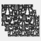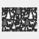 Ein modernes Schwarz-Weiß-Verpackungspapier mit einem wiederholten Rentiermuster in einem Waldwald mit Bäumen, Kiefernzapfen, Sternen und Schneeflocken in Silhouette auf schwarzem Hintergrund.