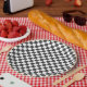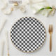 Diese Papierplatte zeichnet sich durch ein festliches schwarz-weißes kariertes Muster mit einem goldenen Rahmen aus.
