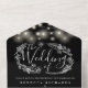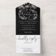 Alles in einer Hochzeitseinladung mit hübschen Saitenlichtern, handgezeichnet Blumengarten und schicker Typografie auf schwarzem Hintergrund. Die Einladung enthält eine perforierte RSVP-Karte, die für Sie individuell adressiert oder links als leere Karte für die Handschrift der Adressdaten Ihres Gastes verwendet werden kann. Entwickelt von Thisisnotme©