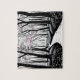 Das Design ist ein Schwarz-Weiß-zeichn eines Weges in einem Wald. Es gibt einen kleinen Spazierweg durch diesen Wald, wo Beobachter lila abstrakte Blätter bemerken werden, die über den Wald ragen.