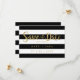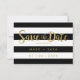 Moderne Save the Date Hochzeitseinladungskarten mit schwarz-weiß gestreiftem Hintergrund mit Goldfolieneffekt-Schriftart.