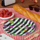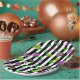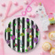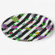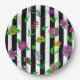 Hübsche Teller aus Blumenpapier mit lila, rosa, blauen, aquamarinen und gelben Blumen mit schwarz-weiß gestreiftem Hintergrund. Hübsch für Hochzeiten, Geburtstage oder Babyduschen.