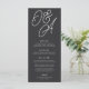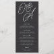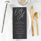 Eine schöne typografische Hochzeitsmenükarte mit Ihren Initialen in überdimensionaler Schriftzeichen oben, in Ton auf Tontönen für einen Wasserzeichen-Effekt. Personalisieren Sie Ihre Menüpunkte unten. Unsere Aschenfarben geben eine klassische Note mit weißen Schriftzeichen auf weichem schwarzem Hintergrund.