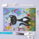 Niedliche, schwarz-weiße Kätzin mit weißem Liebe-Herz auf der Brust und leuchtend grüne Augen, die in einem langen, grünen Gras sitzen. Sie ist umgeben von vielen hübschen farbenfrohen Blume. Blätter und winzige Blume schweben um sie herum und ein Schmetterling fluttert um ihren Kopf. Digitale abstrakte Volkskunst entworfen von C.Katt.