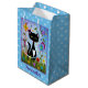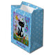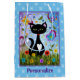 Eine schwarz-weiße Tuxedokatze mit hübschen grünen Augen, rosa Ohren und einem roten Kragen. Sie sitzt an einem hellen Sommertag in einem Garten mit grünem Gras und hübschen farbenfrohen Blume. Um sie herum sind schwebende Blätter und flatternde Schmetterlinge. Dieses digitale Kunstwerk ist mit einem lila Rahmen fertig. Die Hintergrundfarbe ist blau und weist ein Muster von kleinen weißen Pfotendrucken auf. Unter dem Bild befindet sich eine Vorlage in dunkelblauem Text, um Ihren Namen oder Ihre Nachricht zu personalisieren, um diese hübsche Geschenktasche.