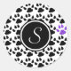 Passend zu mehreren schwarzen Pfotendrucken mit einem Single lila Pfotendruck auf weißem Hintergrund. Anpassbare Monogramm. Entworfen von Robin D. Cox.
