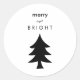 Diese einfachen, modernen Ferienaufkleber sind mit einem schwarzen Weihnachtsbaum auf weißem Hintergrund und den Worten "Fröhlich und hell" versehen.