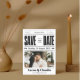 Dieses einzigartige Schwarz-Weiß-Save the Date besticht durch ein spielerisches Zeitungslayout, das sich perfekt für eine angenehme und moderne Hochzeit eignet. Es ist mehr als nur ein Save the Date, es ist eine sonderbare Ankündigung Ihrer Liebe!