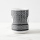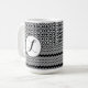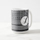 Der obere Teil Ihrer Tasse ist mit einem sich wiederholenden Retro-Medaillonmuster mit konkaven Diamantformen innen bedeckt, und der untere Teil hat Zickzackreihen verschiedener Stärken. Über den mittleren Bereichen, in denen sich die Muster treffen, befindet sich eine Medaille aus weißen Kreisen mit einem schwarz-weißen gepunkteten Rand. Darüber ist ein Platz für Ihr Monogramm. Ändern Sie den Brief in das, was Sie wollen. Sie können auch den Schriftart des Monogramms ändern, wenn Sie möchten.