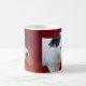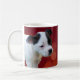 Ein wunderschöner, schwarz-weißer Staffordshire Welpe auf einem Burgundy Bokeh Hintergrund.
