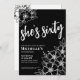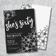 Elegante 60 Schwarz-weißen 60. Geburtstagsparty Einladung. Eine lustige, aber elegante 60. Geburtstagsfeier mit mädchenhaften Schwarz-Weiß-Blume für die Jungen im Herzen. Ein spielerisches Blume-Muster umrahmt eine Schriftzeichen-Typografie "she's sechzig" mit einem klassischeren Serif-Schriftart. Feiern Sie 60 Jahre des Lebens mit diesem schönen botanischen Design. Der Spaß daran ist, dass Sie alle Farben austauschen können!! Sie können nicht nur die Hintergrundfarben und den Schriftart ändern, sondern auch die Zeilen für die Blume ändern. Erhältlich als gedruckte Einladung oder als digitale Einladung zum Herunterladen, dass Sie E-Mail senden können oder vor Ort gedruckt haben!