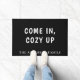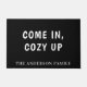 Ein schwarzer Hintergrund, weißer Text. Personalisieren Sie Ihren Familiennamen und fügen Sie ihn hinzu. Text: Komm herein, gemütlich hoch