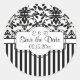Monogramm Hochzeitsticker mit schwarz-weißem Damast-Muster mit Wirbel, Vögeln und Streifen. Sie können Text nach Ihren Anforderungen anpassen