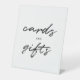 Ein einfaches minimalistisches weißes Hintergrundbild und schwarzer Skripttext "Karten und Geschenke" Hochzeitstisch-Zeichen.