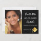 Eine Foto-Save the Date-Karte für eine Graduiertenparty. vorne: Fügen Sie Ihr eigenes Foto in vertikaler Größe des Absolventen hinzu. Ein schicker schwarzer Hintergrund, weißer Text. Vorlagen für Namen und Datum. Der Name und der Text: Save the Date sind mit einem modernen handgeschriebenen Stilskript geschrieben. Mit einem modernen abstrakten Imitat Goldkappe, Tassel Topper. Zurück: Einzelheiten zum Party.
