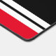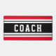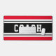 Dieses sportlich-sportliche Design zeichnet sich durch fette, große Buchstaben aus, die auf die individuellen Bedürfnisse zugeschnitten werden können, in einem schwarzen, hervorgehobenen Streifen mit zwei weißen Streifen vor einem farbenfrohen, leuchtend roten Hintergrund. Der COACH-Text kann personalisiert sein.