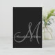 Moderne Hochzeitseinladung mit Monogram. Ein einfaches Design, das den soliden schwarzen Hintergrund und die fett-elegante Form des übergroßen Erstnamens als Gestaltungselement zusammen mit den Vornamen der Braut und des Bräutigams verwendet. Auf der Rückseite der Karte vervollständigt eine einfache, weiße Hintergrundfarbe mit einem hellgrauen Monogramm anfänglichen und eleganten schwarzen Script-Schriftart für den Einladungstext die stilvolle, einfache Hochzeitseinladung. Vollständig anpassbar.Design von Elke Clarke ©2008. Passen Sie Ihre Monogramme, Namen und Hochzeitsfarben an. Fügen Sie alle Ihre Hochzeitsinformationen auf der Rückseite der Karte mit Zazzle's einfach zu bedienenden Menüaufforderungen hinzu oder wählen Sie "Anpassen" für weitere Bearbeitungsoptionen.. Kommt mit weißem Umschlag. Für passendes Zubehör siehe Links unten.
